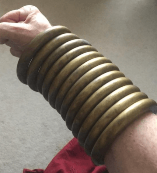 Tie Huan, therefore, refers to the small metal rings worn on the wrist and forearm to add resistance during Kung Fu practice. Brass versions, Huang Tong Huan (黃銅環), offer a softer alternative that’s gentler on the skin while still providing the benefits of weighted training (Fig. 1).