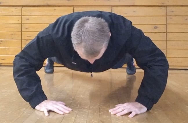 First, adopt the push up position, arms straight.