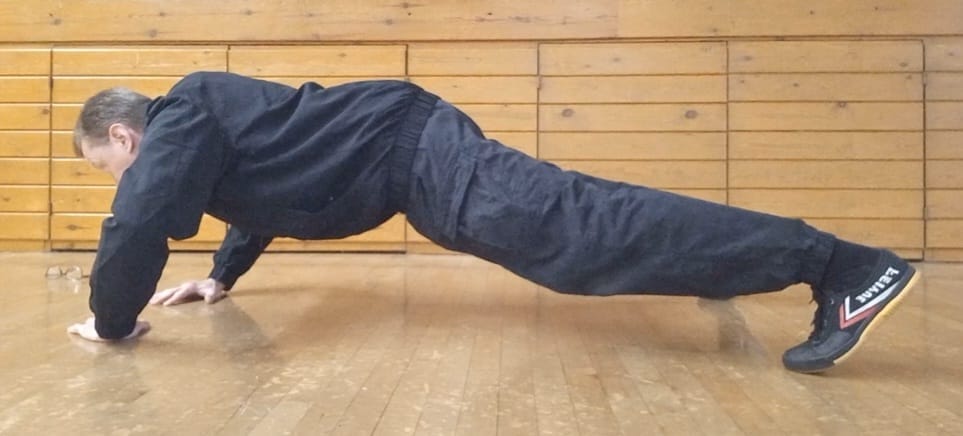 Dynamic movement may expand to include short-range push-up type motions with a circular, connected quality, linking the static strength developed in Fu Wo Zhuang to martial technique. The exercise can also be super-set with other full body dynamic tension routines such as San Zhan (三戰 - Three Battles) which will enhance the development of the trapezius musculature of the neck.