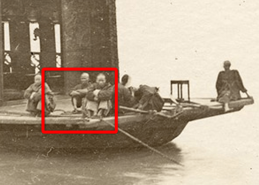 Fig. 2- In this cropped section from Flower Boat, Guangzhou, you can clearly make out the circular ring being held by the second man from the left. (Lai Fong (ca.1839 –1890), Flower Boat, Guangzhou, ca.1870s. Cropped detail. Public domain).