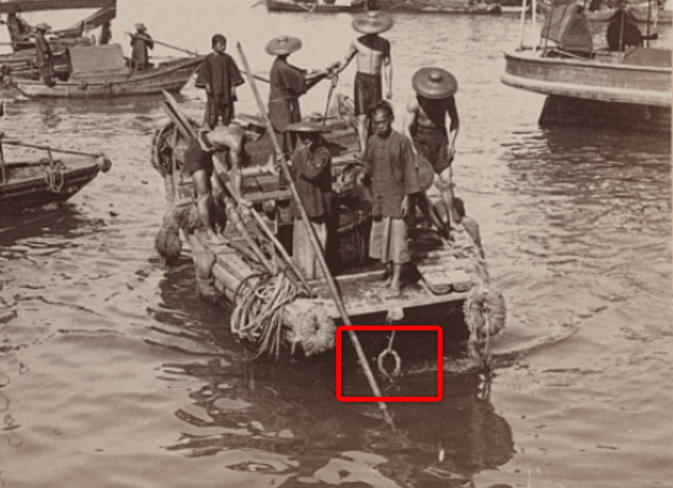Fig. 3 - Mooring ring on the bow of a Chinese fishing boat. Arrival of a Chinese fishing boat, Hong Kong, China (LC-DIG-ppmsca-08736). Adapted from an image courtesy of the Library of Congress, Prints and Photographs Division.
